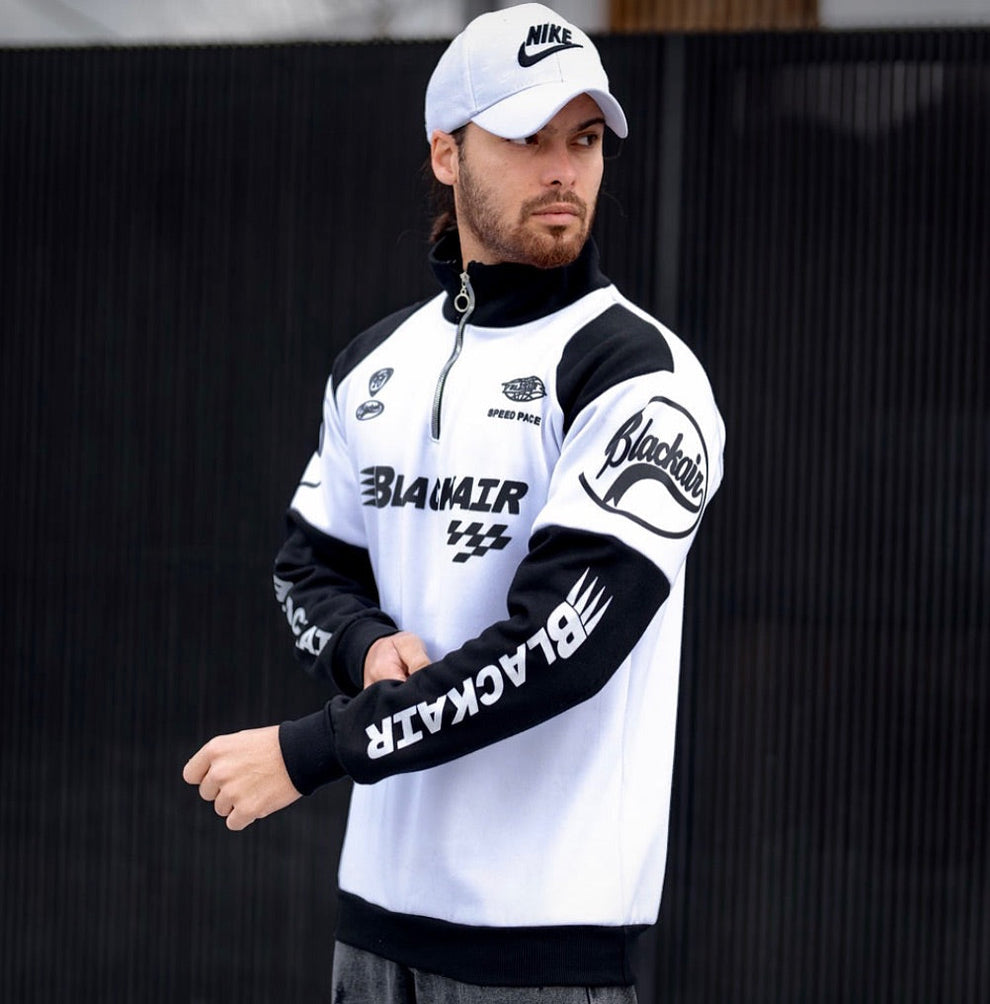 Bold Contrast Panels: Black and white design for a standout streetwear look.